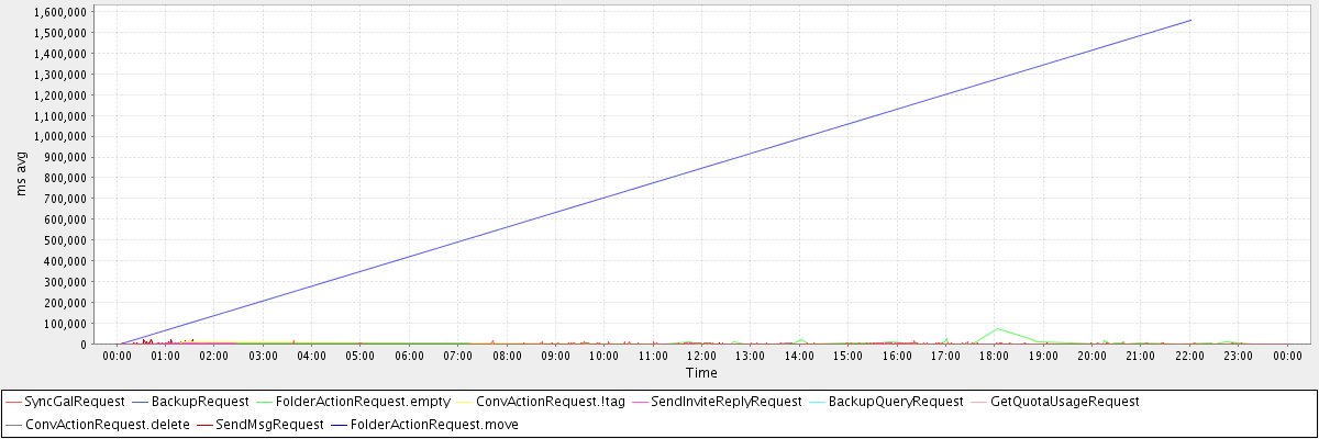 avg(SyncGalRequest) = 1512.23 avg(BackupRequest) = 779097.00 avg(FolderActionRequest.empty) = 4628.03 avg(ConvActionRequest.!tag) = 1531.20 avg(SendInviteReplyRequest) = 720.65 avg(BackupQueryRequest) = 625.40 avg(GetQuotaUsageRequest) = 3276.00 avg(ConvActionRequest.delete) = 430.87 avg(SendMsgRequest) = 489.15 avg(FolderActionRequest.move) = 829.80