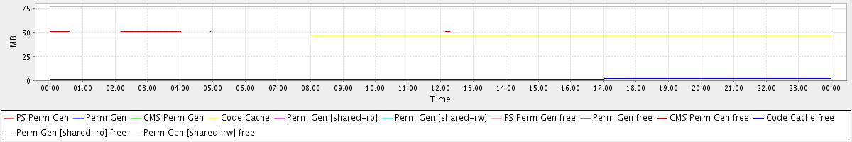 avg(PS Perm Gen) = 0.00 avg(Perm Gen) = 0.00 avg(CMS Perm Gen) = 76.33 avg(Code Cache) = 46.18 avg(Perm Gen [shared-ro]) = 0.00 avg(Perm Gen [shared-rw]) = 0.00 avg(PS Perm Gen free) = 0.00 avg(Perm Gen free) = 0.00 avg(CMS Perm Gen free) = 51.10 avg(Code Cache free) = 1.44 avg(Perm Gen [shared-ro] free) = 0.00 avg(Perm Gen [shared-rw] free) = 0.00