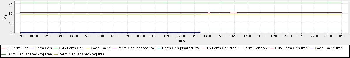 avg(PS Perm Gen) = 0.00 avg(Perm Gen) = 0.00 avg(CMS Perm Gen) = 77.23 avg(Code Cache) = 46.52 avg(Perm Gen [shared-ro]) = 0.00 avg(Perm Gen [shared-rw]) = 0.00 avg(PS Perm Gen free) = 0.00 avg(Perm Gen free) = 0.00 avg(CMS Perm Gen free) = 51.79 avg(Code Cache free) = 1.04 avg(Perm Gen [shared-ro] free) = 0.00 avg(Perm Gen [shared-rw] free) = 0.00