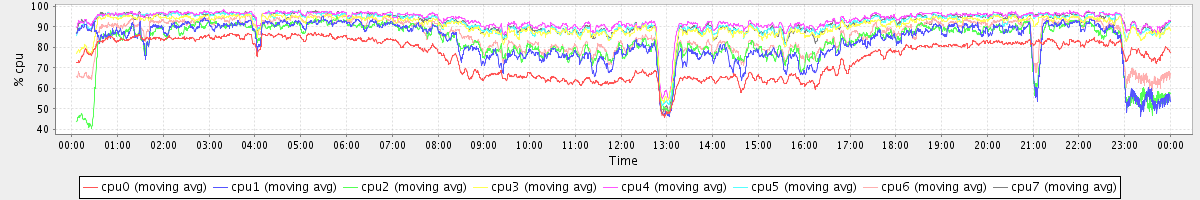 avg(cpu0) = 75.42 avg(cpu1) = 82.05 avg(cpu2) = 82.00 avg(cpu3) = 90.30 avg(cpu4) = 93.28 avg(cpu5) = 91.76 avg(cpu6) = 85.09 avg(cpu7) = 91.85
