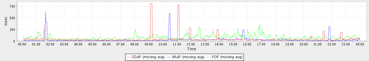 avg(AutoCompleteGalRequest) = 395.05 avg(SyncGalRequest) = 1533.83 avg(SearchGalRequest) = 331.22 avg(MaintainTablesRequest) = 234319.00 avg(GetQuotaUsageRequest) = 3108.00 avg(ConvActionRequest.delete) = 318.21 avg(DeleteAccountRequest) = 2764.50 avg(SendMsgRequest) = 204.43 avg(BackupRequest) = 49362.50 avg(FolderActionRequest.empty) = 2410.74