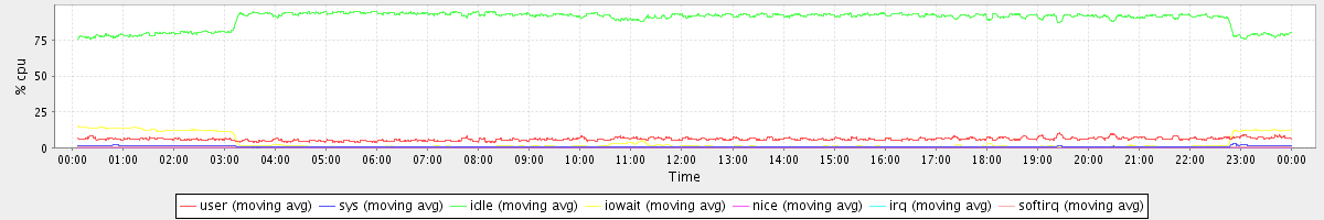 avg(user) = 6.01 avg(sys) = 0.66 avg(idle) = 89.92 avg(iowait) = 3.20 avg(nice) = 0.00 avg(irq) = 0.02 avg(softirq) = 0.19