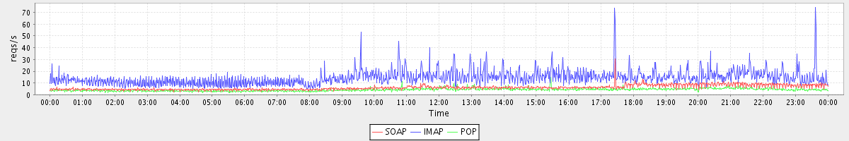 Host zm04.stanford.edu: Mailboxd: Request Rate by Client Protocol