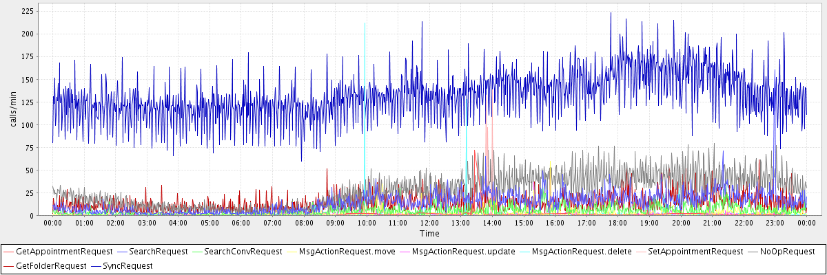 max(GetAppointmentRequest) = 72.00 max(SearchRequest) = 160.00 max(SearchConvRequest) = 33.00 max(MsgActionRequest.move) = 60.00 max(MsgActionRequest.update) = 53.00 max(MsgActionRequest.delete) = 212.00 max(SetAppointmentRequest) = 138.00 max(NoOpRequest) = 79.00 max(GetFolderRequest) = 61.00 max(SyncRequest) = 223.00