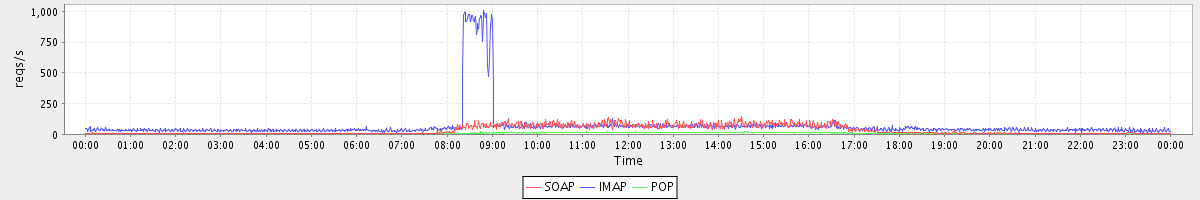 Host zm07.stanford.edu: Mailboxd: Request Rate by Client Protocol