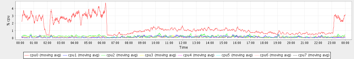 avg(cpu0) = 1.43 avg(cpu1) = 0.11 avg(cpu2) = 0.20 avg(cpu3) = 0.09 avg(cpu4) = 0.07 avg(cpu5) = 0.07 avg(cpu6) = 0.12 avg(cpu7) = 0.06