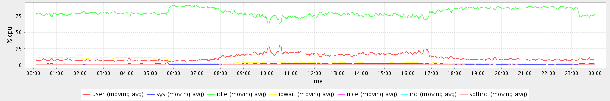 avg(user) = 11.53 avg(sys) = 1.64 avg(idle) = 81.07 avg(iowait) = 5.20 avg(nice) = 0.00 avg(irq) = 0.05 avg(softirq) = 0.52