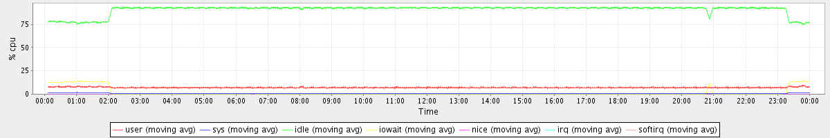 avg(user) = 6.97 avg(sys) = 0.71 avg(idle) = 90.65 avg(iowait) = 1.65 avg(nice) = 0.00 avg(irq) = 0.00 avg(softirq) = 0.01