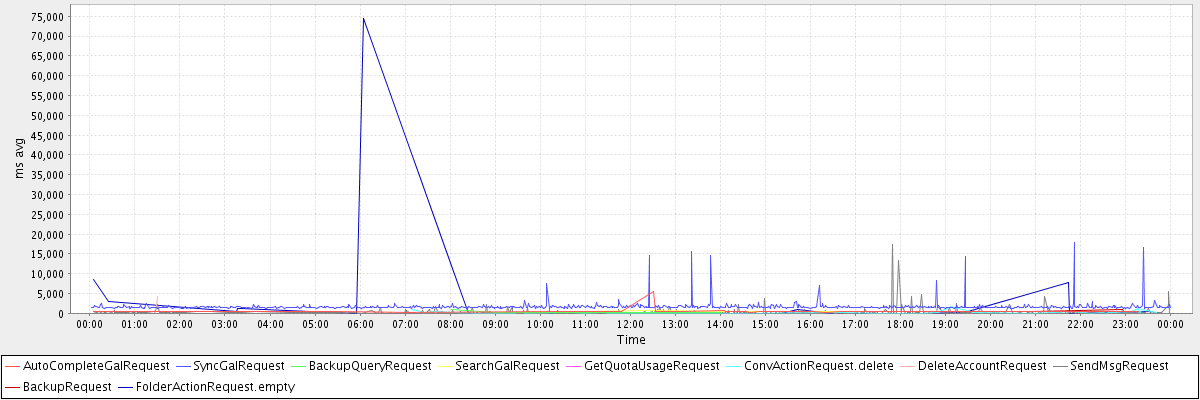 avg(AutoCompleteGalRequest) = 532.41 avg(SyncGalRequest) = 1738.37 avg(BackupQueryRequest) = 371.25 avg(SearchGalRequest) = 487.55 avg(GetQuotaUsageRequest) = 3210.00 avg(ConvActionRequest.delete) = 289.55 avg(DeleteAccountRequest) = 2137.00 avg(SendMsgRequest) = 279.54 avg(BackupRequest) = 696.50 avg(FolderActionRequest.empty) = 3140.38