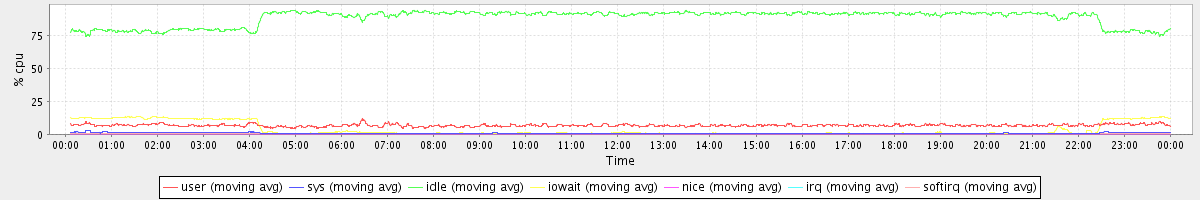 avg(user) = 6.80 avg(sys) = 0.73 avg(idle) = 88.56 avg(iowait) = 3.68 avg(nice) = 0.00 avg(irq) = 0.02 avg(softirq) = 0.21
