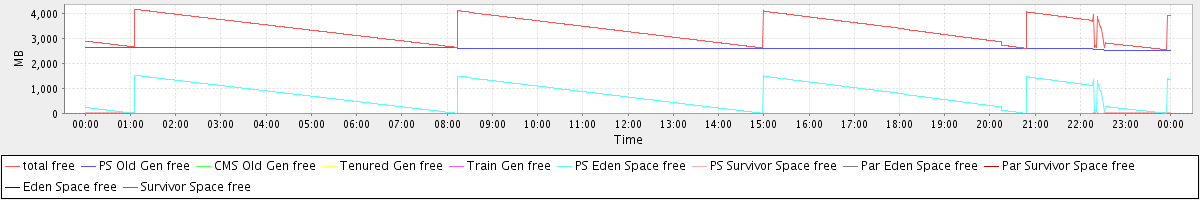 avg(total free) = 3359.82 avg(PS Old Gen free) = 2620.75 avg(CMS Old Gen free) = 0.00 avg(Tenured Gen free) = 0.00 avg(Train Gen free) = 0.00 avg(PS Eden Space free) = 736.04 avg(PS Survivor Space free) = 3.03 avg(Par Eden Space free) = 0.00 avg(Par Survivor Space free) = 0.00 avg(Eden Space free) = 0.00 avg(Survivor Space free) = 0.00