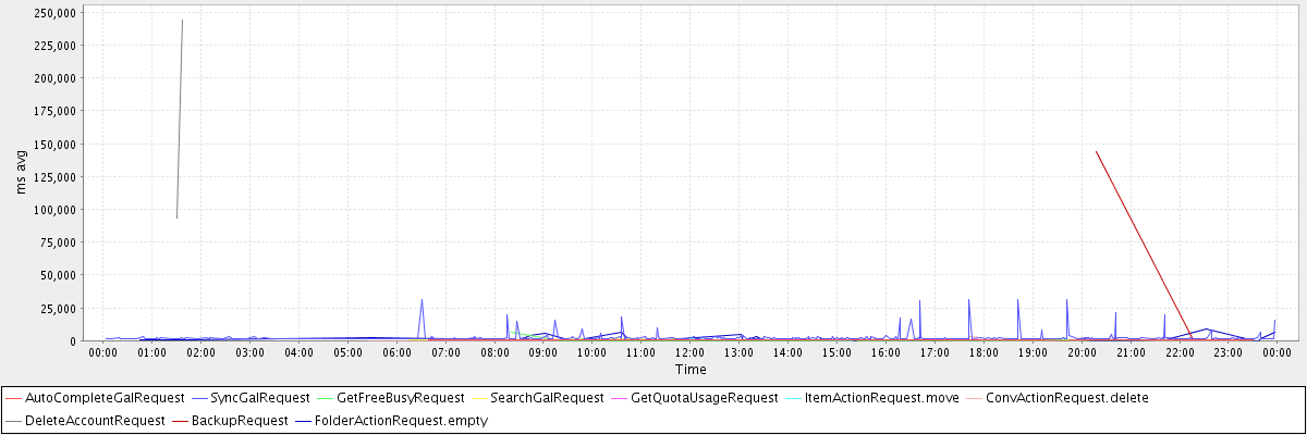 avg(AutoCompleteGalRequest) = 497.96 avg(SyncGalRequest) = 2468.93 avg(GetFreeBusyRequest) = 804.73 avg(SearchGalRequest) = 582.06 avg(GetQuotaUsageRequest) = 3082.00 avg(ItemActionRequest.move) = 540.40 avg(ConvActionRequest.delete) = 459.95 avg(DeleteAccountRequest) = 168770.00 avg(BackupRequest) = 73227.00 avg(FolderActionRequest.empty) = 1028.03