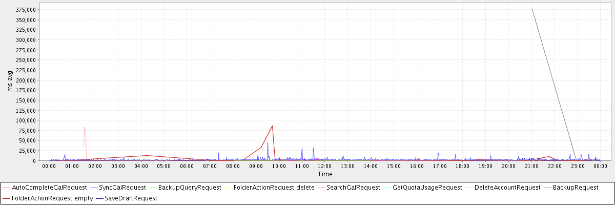 avg(AutoCompleteGalRequest) = 569.75 avg(SyncGalRequest) = 2316.00 avg(BackupQueryRequest) = 208.00 avg(FolderActionRequest.delete) = 3963.50 avg(SearchGalRequest) = 829.00 avg(GetQuotaUsageRequest) = 3262.00 avg(DeleteAccountRequest) = 45900.00 avg(BackupRequest) = 187958.50 avg(FolderActionRequest.empty) = 3957.91 avg(SaveDraftRequest) = 205.82