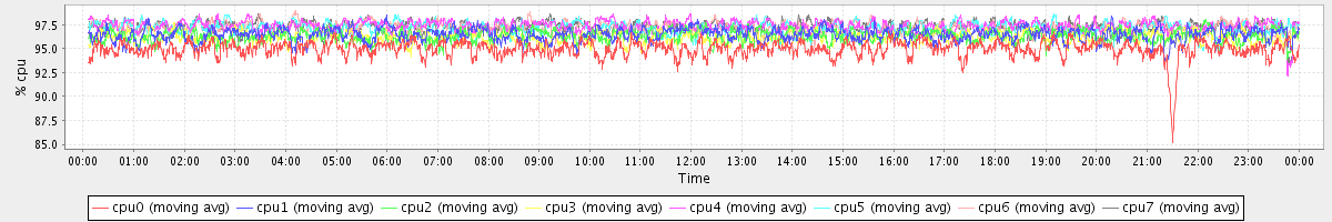 avg(cpu0) = 94.99 avg(cpu1) = 96.48 avg(cpu2) = 96.33 avg(cpu3) = 96.19 avg(cpu4) = 97.37 avg(cpu5) = 97.19 avg(cpu6) = 97.21 avg(cpu7) = 97.26