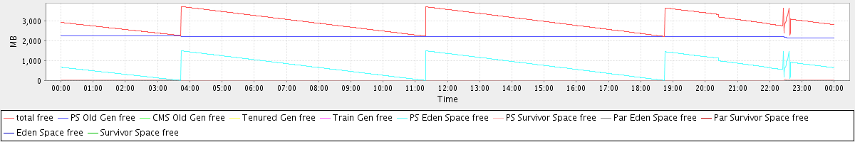 avg(total free) = 2964.83 avg(PS Old Gen free) = 2228.06 avg(CMS Old Gen free) = 0.00 avg(Tenured Gen free) = 0.00 avg(Train Gen free) = 0.00 avg(PS Eden Space free) = 730.44 avg(PS Survivor Space free) = 6.32 avg(Par Eden Space free) = 0.00 avg(Par Survivor Space free) = 0.00 avg(Eden Space free) = 0.00 avg(Survivor Space free) = 0.00