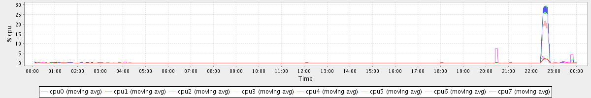 avg(cpu0) = 0.54 avg(cpu1) = 0.42 avg(cpu2) = 0.37 avg(cpu3) = 0.36 avg(cpu4) = 0.25 avg(cpu5) = 0.20 avg(cpu6) = 0.18 avg(cpu7) = 0.15