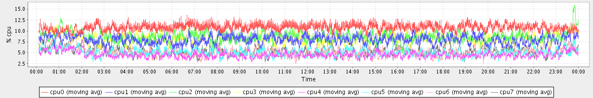avg(cpu0) = 10.78 avg(cpu1) = 7.98 avg(cpu2) = 8.61 avg(cpu3) = 8.30 avg(cpu4) = 4.55 avg(cpu5) = 5.11 avg(cpu6) = 5.19 avg(cpu7) = 5.29