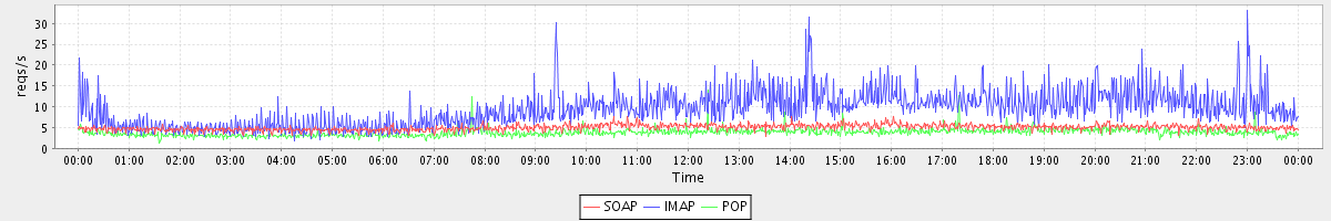 Host zm04.stanford.edu: Mailboxd: Request Rate by Client Protocol