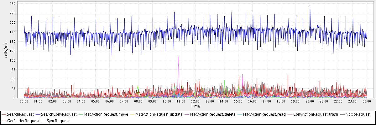 max(SearchRequest) = 40.00 max(SearchConvRequest) = 31.00 max(MsgActionRequest.move) = 47.00 max(MsgActionRequest.update) = 46.00 max(MsgActionRequest.delete) = 109.00 max(MsgActionRequest.read) = 36.00 max(ConvActionRequest.trash) = 29.00 max(NoOpRequest) = 42.00 max(GetFolderRequest) = 61.00 max(SyncRequest) = 244.00