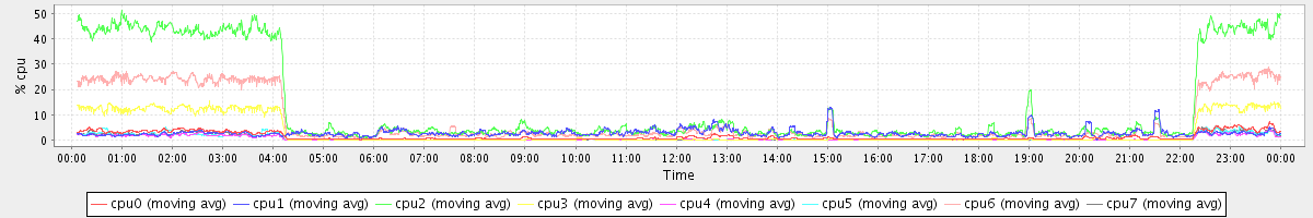 avg(cpu0) = 16.31 avg(cpu1) = 7.71 avg(cpu2) = 8.81 avg(cpu3) = 8.41 avg(cpu4) = 6.34 avg(cpu5) = 7.66 avg(cpu6) = 7.76 avg(cpu7) = 7.14
