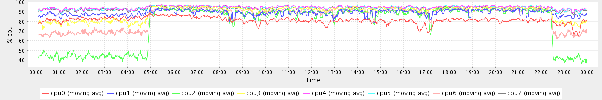 avg(cpu0) = 81.26 avg(cpu1) = 88.94 avg(cpu2) = 77.22 avg(cpu3) = 89.59 avg(cpu4) = 94.56 avg(cpu5) = 94.14 avg(cpu6) = 85.09 avg(cpu7) = 93.56