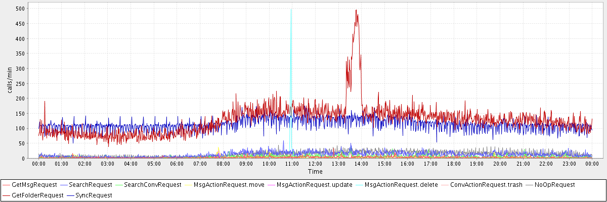 max(GetMsgRequest) = 34.00 max(SearchRequest) = 58.00 max(SearchConvRequest) = 41.00 max(MsgActionRequest.move) = 37.00 max(MsgActionRequest.update) = 35.00 max(MsgActionRequest.delete) = 497.00 max(ConvActionRequest.trash) = 34.00 max(NoOpRequest) = 43.00 max(GetFolderRequest) = 495.00 max(SyncRequest) = 175.00