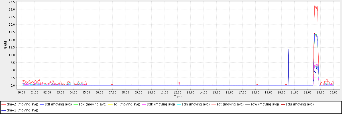 avg(dm-2) = 0.66 avg(sdl) = 0.23 avg(sdx) = 0.23 avg(sdi) = 0.23 avg(sdk) = 0.17 avg(sdh) = 0.16 avg(sdt) = 0.15 avg(sdw) = 0.17 avg(sdu) = 0.23 avg(dm-1) = 0.13