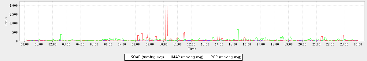 avg(AutoCompleteGalRequest) = 787.95 avg(SyncGalRequest) = 1454.03 avg(BackupQueryRequest) = 255.50 avg(GetFreeBusyRequest) = 386.24 avg(SearchGalRequest) = 518.09 avg(GetQuotaUsageRequest) = 3256.00 avg(ConvActionRequest.delete) = 541.72 avg(DeleteAccountRequest) = 18625.67 avg(BackupRequest) = 143211.50 avg(FolderActionRequest.empty) = 4294.46