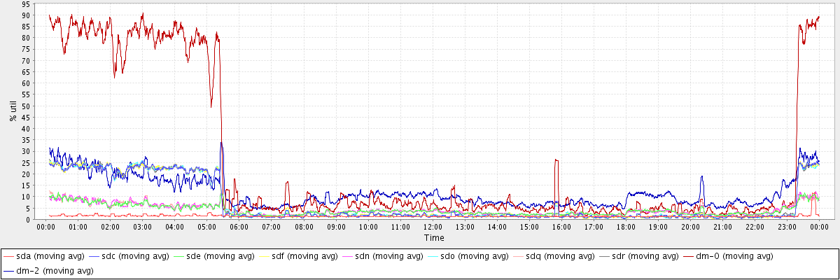 avg(sda) = 1.41 avg(sdc) = 6.90 avg(sde) = 3.99 avg(sdf) = 6.90 avg(sdn) = 4.07 avg(sdo) = 6.90 avg(sdq) = 4.07 avg(sdr) = 6.90 avg(dm-0) = 24.88 avg(dm-2) = 11.81