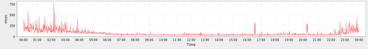 avg(AutoCompleteGalRequest) = 755.72 avg(SyncGalRequest) = 1684.16 avg(BackupQueryRequest) = 287.50 avg(SearchGalRequest) = 2226.78 avg(GetQuotaUsageRequest) = 3265.00 avg(ConvActionRequest.delete) = 307.18 avg(DeleteAccountRequest) = 12826.00 avg(ImportContactsRequest) = 598.00 avg(BackupRequest) = 176040.00 avg(FolderActionRequest.empty) = 5025.97