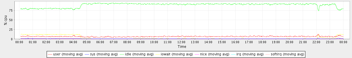 avg(user) = 6.45 avg(sys) = 0.69 avg(idle) = 89.28 avg(iowait) = 3.37 avg(nice) = 0.00 avg(irq) = 0.02 avg(softirq) = 0.19