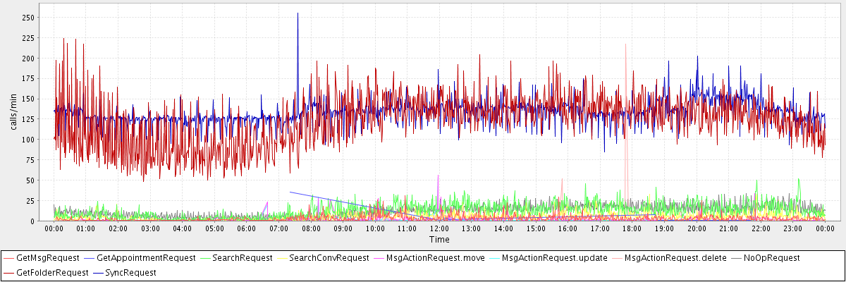 max(GetMsgRequest) = 31.00 max(GetAppointmentRequest) = 35.00 max(SearchRequest) = 52.00 max(SearchConvRequest) = 33.00 max(MsgActionRequest.move) = 56.00 max(MsgActionRequest.update) = 56.00 max(MsgActionRequest.delete) = 217.00 max(NoOpRequest) = 34.00 max(GetFolderRequest) = 224.00 max(SyncRequest) = 255.00