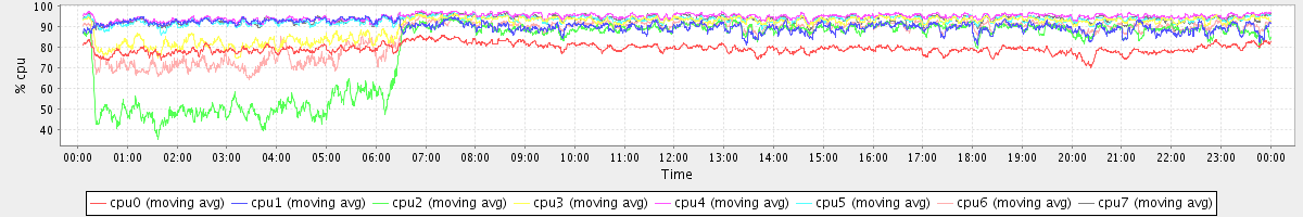 avg(cpu0) = 79.28 avg(cpu1) = 90.11 avg(cpu2) = 79.05 avg(cpu3) = 90.32 avg(cpu4) = 94.72 avg(cpu5) = 93.11 avg(cpu6) = 86.09 avg(cpu7) = 93.43