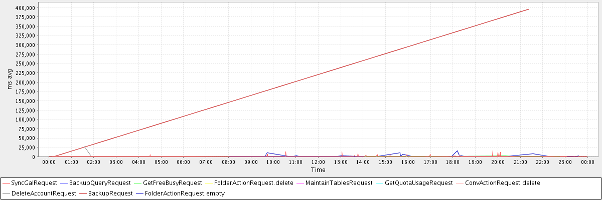 avg(SyncGalRequest) = 873.75 avg(BackupQueryRequest) = 188.00 avg(GetFreeBusyRequest) = 475.73 avg(FolderActionRequest.delete) = 7045.00 avg(MaintainTablesRequest) = 318793.00 avg(GetQuotaUsageRequest) = 3239.00 avg(ConvActionRequest.delete) = 481.16 avg(DeleteAccountRequest) = 15327.50 avg(BackupRequest) = 198139.50 avg(FolderActionRequest.empty) = 2324.26