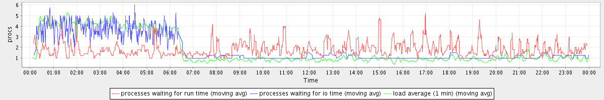 avg(processes waiting for run time) = 0.73 avg(processes waiting for io time) = 0.84 avg(load average (1 min)) = 1.72