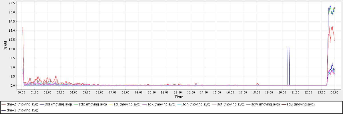 avg(dm-2) = 0.67 avg(sdl) = 0.57 avg(sdx) = 0.56 avg(sdi) = 0.56 avg(sdk) = 0.17 avg(sdh) = 0.17 avg(sdt) = 0.16 avg(sdw) = 0.18 avg(sdu) = 0.57 avg(dm-1) = 0.17