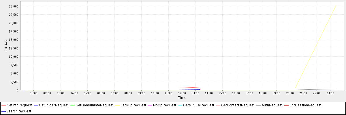 avg(GetInfoRequest) = 588.67 avg(GetFolderRequest) = 11.67 avg(GetDomainInfoRequest) = 0.28 avg(BackupRequest) = 12993.00 avg(NoOpRequest) = 0.06 avg(GetMiniCalRequest) = 750.00 avg(GetContactsRequest) = 2.00 avg(AuthRequest) = 107.75 avg(EndSessionRequest) = 1.00 avg(SearchRequest) = 118.00