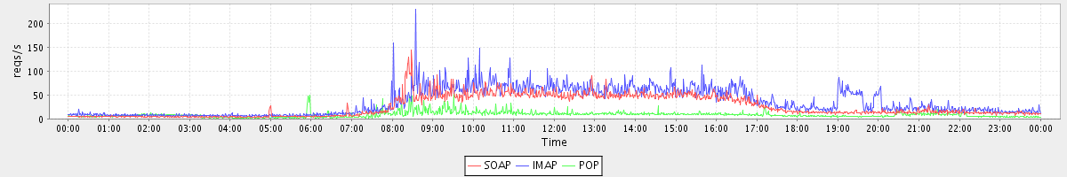 Host zm04.stanford.edu: Mailboxd: Request Rate by Client Protocol