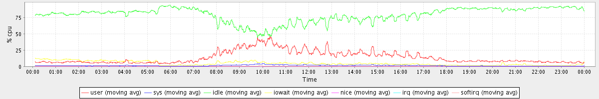 avg(user) = 13.87 avg(sys) = 1.41 avg(idle) = 79.36 avg(iowait) = 4.85 avg(nice) = 0.00 avg(irq) = 0.05 avg(softirq) = 0.46
