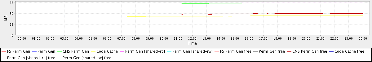 avg(PS Perm Gen) = 0.00 avg(Perm Gen) = 0.00 avg(CMS Perm Gen) = 73.03 avg(Code Cache) = 43.48 avg(Perm Gen [shared-ro]) = 0.00 avg(Perm Gen [shared-rw]) = 0.00 avg(PS Perm Gen free) = 0.00 avg(Perm Gen free) = 0.00 avg(CMS Perm Gen free) = 48.83 avg(Code Cache free) = 0.12 avg(Perm Gen [shared-ro] free) = 0.00 avg(Perm Gen [shared-rw] free) = 0.00
