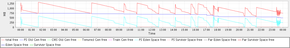 avg(total free) = 954.39 avg(PS Old Gen free) = 662.03 avg(CMS Old Gen free) = 0.00 avg(Tenured Gen free) = 0.00 avg(Train Gen free) = 0.00 avg(PS Eden Space free) = 284.51 avg(PS Survivor Space free) = 7.86 avg(Par Eden Space free) = 0.00 avg(Par Survivor Space free) = 0.00 avg(Eden Space free) = 0.00 avg(Survivor Space free) = 0.00