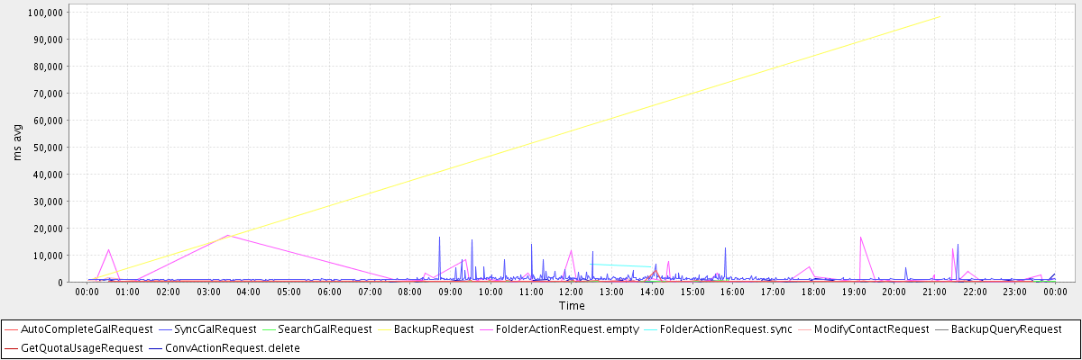 avg(AutoCompleteGalRequest) = 258.66 avg(SyncGalRequest) = 1247.45 avg(SearchGalRequest) = 259.97 avg(BackupRequest) = 49677.50 avg(FolderActionRequest.empty) = 1773.25 avg(FolderActionRequest.sync) = 6076.50 avg(ModifyContactRequest) = 232.47 avg(BackupQueryRequest) = 262.00 avg(GetQuotaUsageRequest) = 3260.00 avg(ConvActionRequest.delete) = 316.87