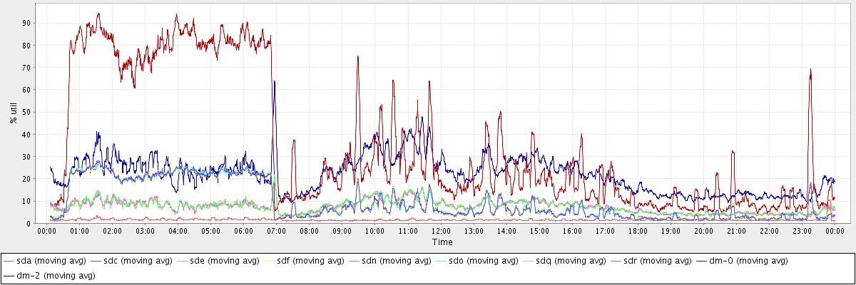 avg(sda) = 1.53 avg(sdc) = 9.44 avg(sde) = 7.56 avg(sdf) = 9.34 avg(sdn) = 7.52 avg(sdo) = 9.39 avg(sdq) = 7.51 avg(sdr) = 9.39 avg(dm-0) = 34.27 avg(dm-2) = 21.99