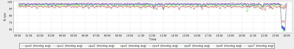 avg(cpu0) = 92.72 avg(cpu1) = 95.49 avg(cpu2) = 94.62 avg(cpu3) = 95.24 avg(cpu4) = 97.11 avg(cpu5) = 96.22 avg(cpu6) = 96.30 avg(cpu7) = 96.54