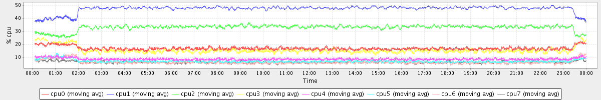 avg(cpu0) = 16.73 avg(cpu1) = 47.22 avg(cpu2) = 32.81 avg(cpu3) = 15.36 avg(cpu4) = 8.42 avg(cpu5) = 6.83 avg(cpu6) = 6.00 avg(cpu7) = 6.08