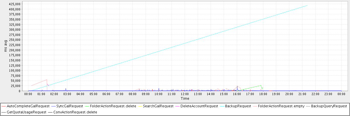 avg(AutoCompleteGalRequest) = 340.66 avg(SyncGalRequest) = 1317.04 avg(FolderActionRequest.delete) = 6987.50 avg(SearchGalRequest) = 372.12 avg(DeleteAccountRequest) = 28612.50 avg(BackupRequest) = 209669.50 avg(FolderActionRequest.empty) = 3122.25 avg(BackupQueryRequest) = 339.00 avg(GetQuotaUsageRequest) = 3225.00 avg(ConvActionRequest.delete) = 407.05