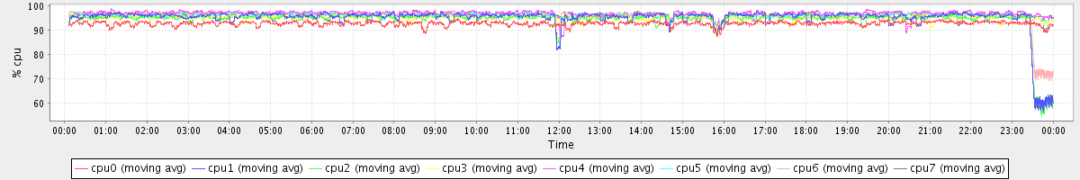 avg(cpu0) = 92.88 avg(cpu1) = 95.01 avg(cpu2) = 94.42 avg(cpu3) = 95.29 avg(cpu4) = 96.88 avg(cpu5) = 96.17 avg(cpu6) = 96.20 avg(cpu7) = 96.32