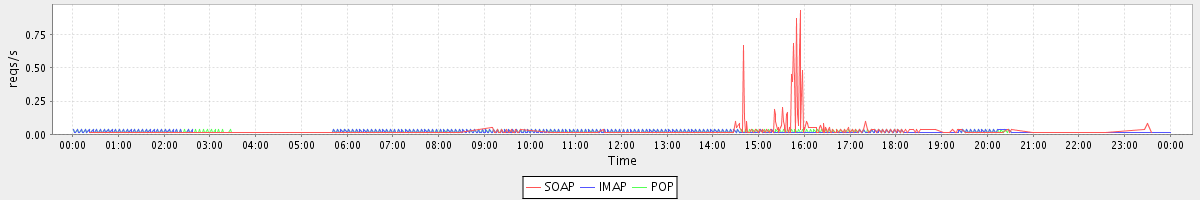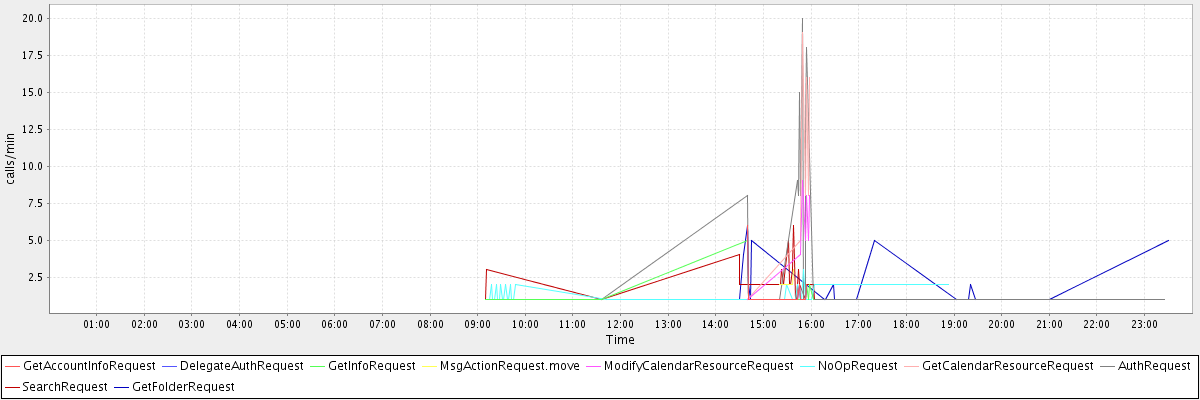 max(GetAccountInfoRequest) = 6.00 max(DelegateAuthRequest) = 6.00 max(GetInfoRequest) = 5.00 max(MsgActionRequest.move) = 3.00 max(ModifyCalendarResourceRequest) = 9.00 max(NoOpRequest) = 3.00 max(GetCalendarResourceRequest) = 19.00 max(AuthRequest) = 20.00 max(SearchRequest) = 6.00 max(GetFolderRequest) = 6.00