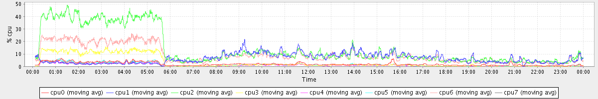 avg(cpu0) = 2.04 avg(cpu1) = 0.33 avg(cpu2) = 0.35 avg(cpu3) = 0.27 avg(cpu4) = 0.18 avg(cpu5) = 0.25 avg(cpu6) = 0.31 avg(cpu7) = 0.26