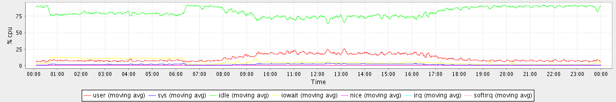 avg(user) = 11.26 avg(sys) = 1.52 avg(idle) = 81.43 avg(iowait) = 5.22 avg(nice) = 0.00 avg(irq) = 0.04 avg(softirq) = 0.54